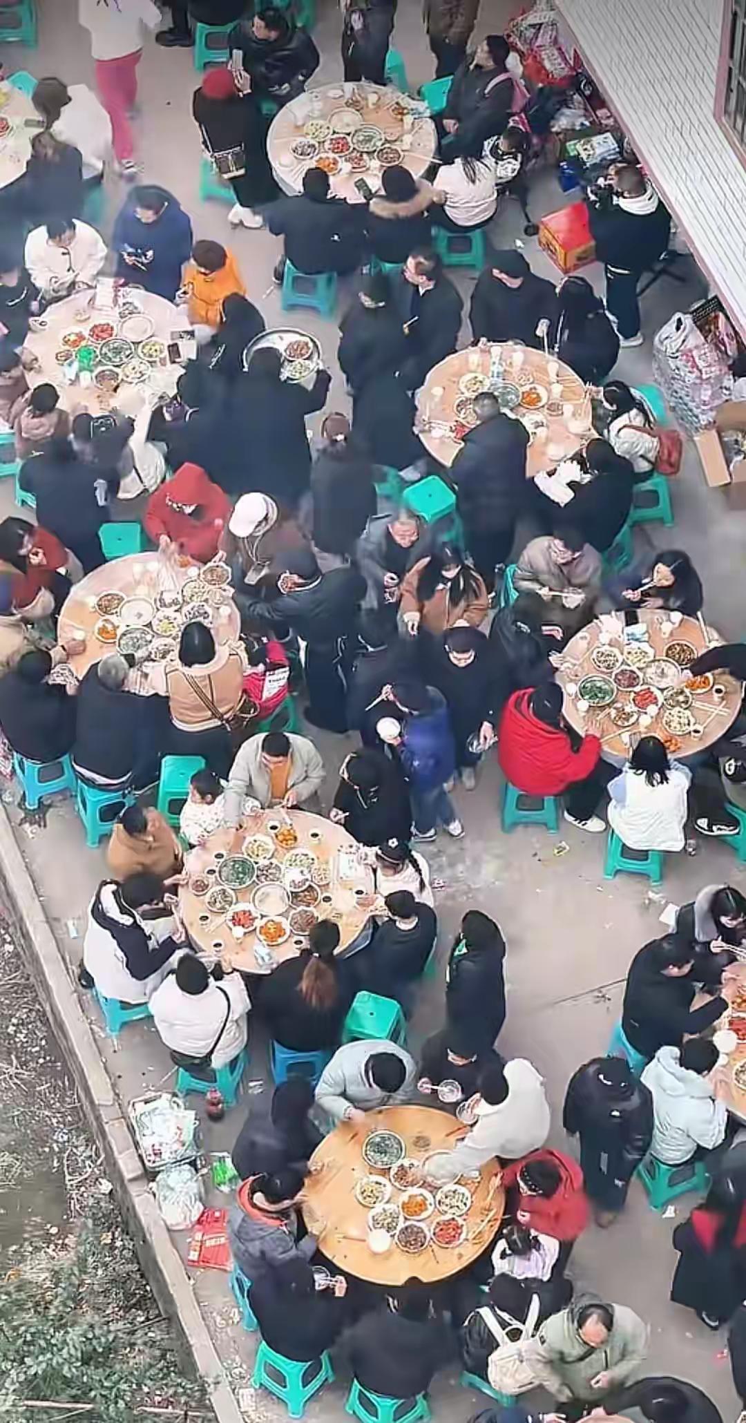 原本计划的两头猪,在汹涌人潮面前杯水车薪,最终当地文旅部门也紧急支援两头、以五头猪的规模,勉强撑起了蔓延至田间地头的三百桌流水席。