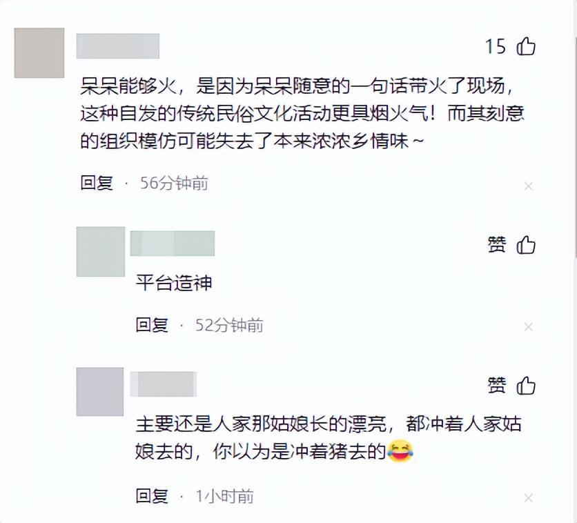 有网友在官媒评论区下面直接留言称,呆呆能够火,是因为呆呆随意的一句话带火了现场,这种自发的传统民俗文化活动更具烟火气!而其刻意的组织模仿可能失去了本来浓浓乡情味~
